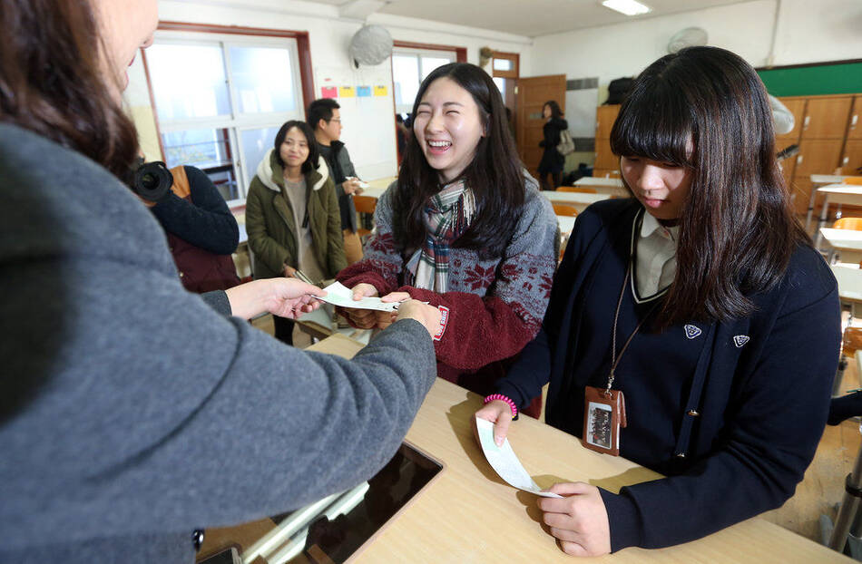 2014年11月12日,韩国首尔,韩国高考前一天,丰文女子高中高三学生们拿到了准考证,高一高二的学生们为高三学姐打气助威。