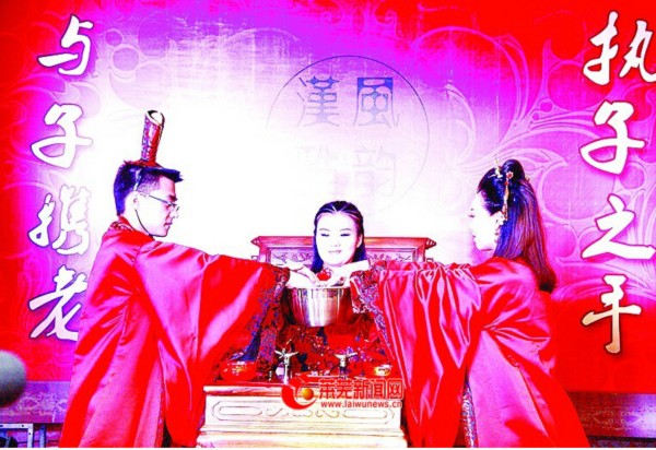 对席礼、同牢礼、合卺(jin)礼、结发礼、执手礼……近日,我市市民采用汉式礼仪举办婚礼,同样来自我市婚庆公司的司仪用文言文主持,婚礼现场效果极佳。[详细]