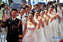 8月1日,在武汉市民之家,18对新人在集体婚礼上向亲友挥手致意。当日,来自驻汉海军、陆军、空军和武警部队的18位官兵在武汉市民之家举行集体婚礼,以此庆祝中国人民解放军建军87周年。[详细]