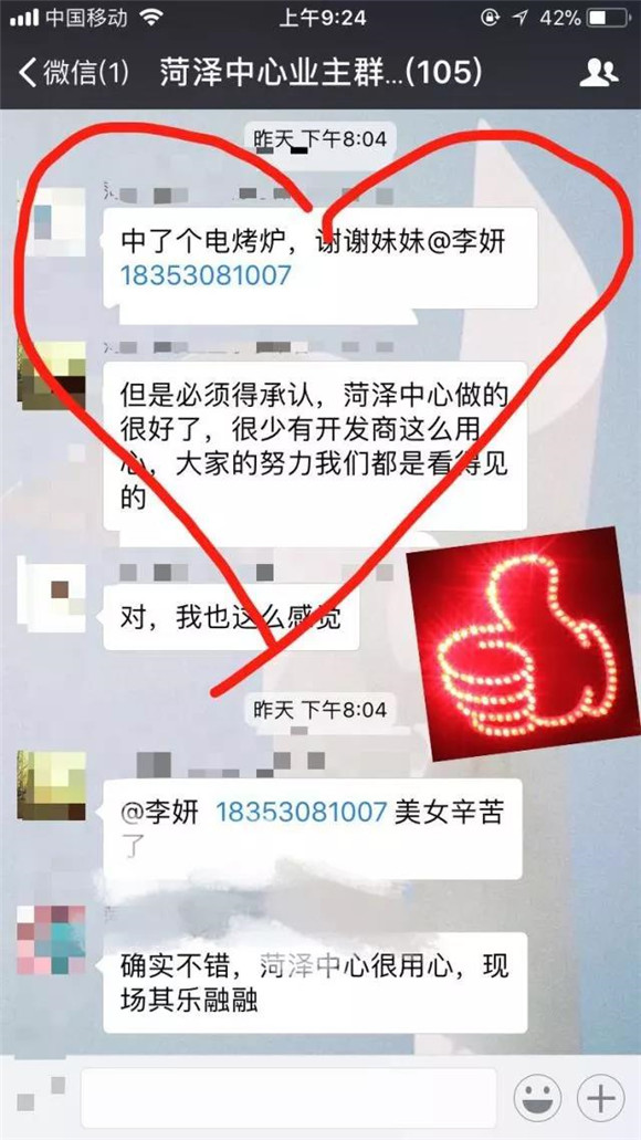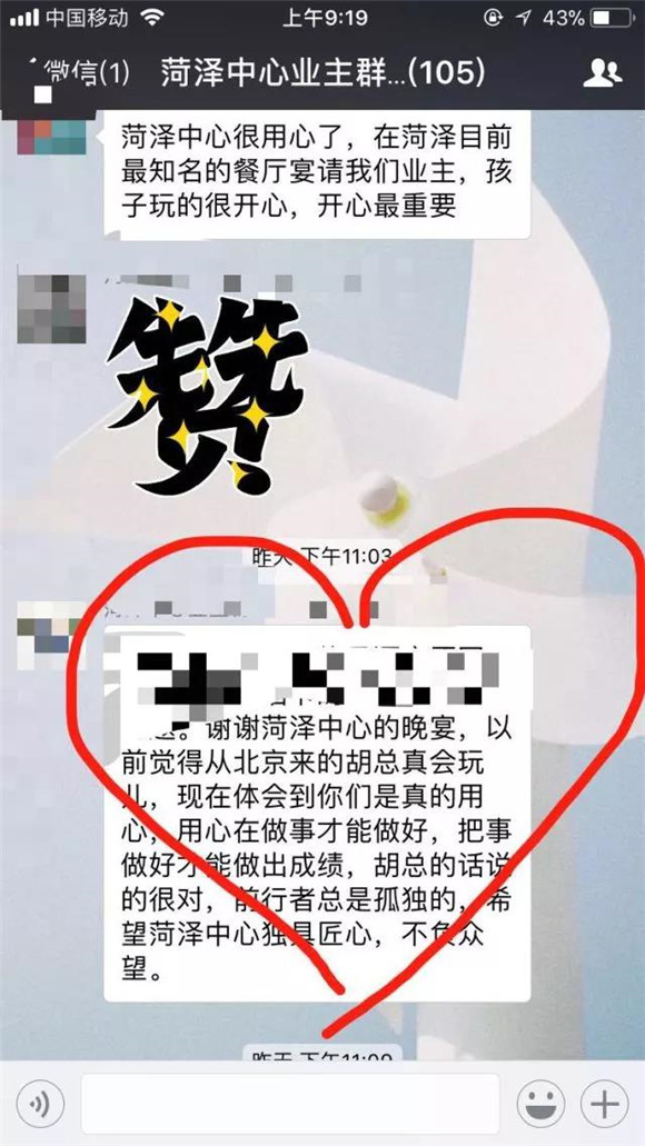 有的客户还专门在业主群向菏泽中心表示感谢。金杯、银杯不如广大业主的口碑。购房业主的赞许是一面闪闪发光的旗帜,彰显着菏泽中心的卓尔不群。菏泽中心项目组定当再接再厉,不忘初心,在新的一年里拿出更高的标准严格要求自己,努力回报亲爱的业主朋友。