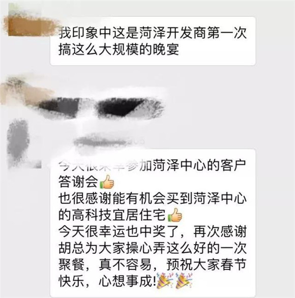 虽然团年宴刚刚落下帷幕,可家人的温暖却常在心中,尤其是家人们发自肺腑的感言,更是激励前行的动力。此次团年宴的主题之一泽遇芳邻,更是借此机会让业主们共聚一堂共迎新年,同时也为客户提供了一个邻里之间相互了解的平台和契机。这次的晚宴的高标准和规格让很多业主朋友都忍不住发起了朋友圈,高调的“炫耀”自己的身份,这是对开发商一种发自肺腑的自豪感,是对菏泽中心最大的肯定。客户一直在用“用心了”、“骄傲”“为菏泽中心点赞”等词表达自己心情,让项目组也非常的感动,为有这么一群可爱的家人而自豪。