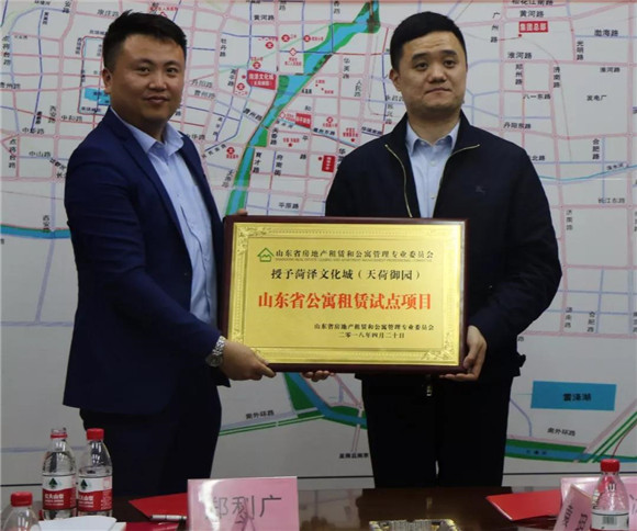 接下来,山东福汉集团副董事长兼秘书长王子冰与山东银石商业集团董事长郑利广就“银石·悦兰都市精宿入驻菏泽文化城”进行正式签约,山东房地产租赁和公寓管理专业委员会理事长杨炎博对此签约给予见证,并向福汉集团菏泽文化城项目进行授牌!