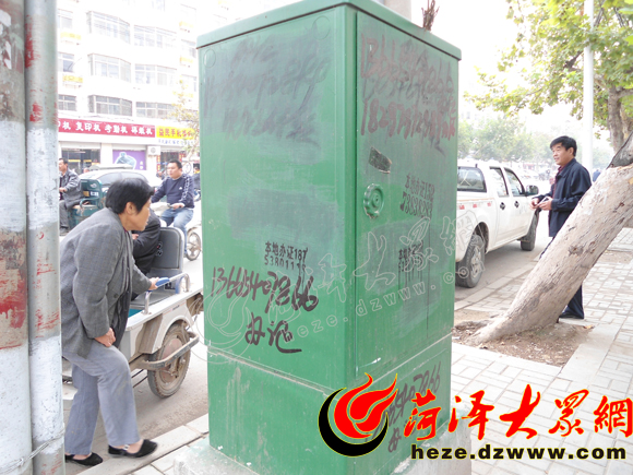 10月13日上午,记者在菏泽青年路看到,本被粉刷一新的路边高低压配电箱上,涂满了办证的电话号码。如此败貌之“笔”不仅存在于青年路,还存在于市区的其他各条道路。