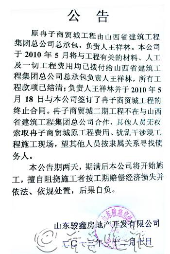 然而,对于李云他们所说的拖欠工程款问题,自称山东骏鑫房地产开发有限公司总经理的金先生解释,2010年5月份,公司就将工程款结清了,把钱付给了王祥林,并不存在拖欠工程款情况。金先生还向记者提供了相关材料以及与王祥林解除施工合同的材料,落款日期为2010年5月18日。针对此事,山东骏鑫房地产开发有限公司近日贴出了结清工程款公告。