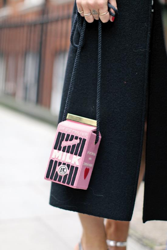 粉色的牛奶纸质包装袋,再配上一条黑色的线绳,就成了另一个趣味十足的小包包。这款小包包最好地诠释了“只有想不到,没有做不到”的这个概念,相信任何女性都无法拒绝这款包包对其的诱惑。