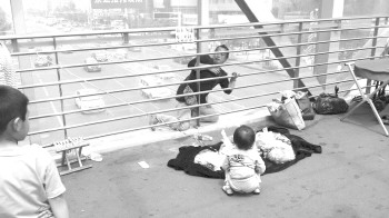 25日,在南大街购物中心附近的过街天桥上,一名中年妇女正在呵斥被绳子绑在栏杆上的女童。妇女自称是孩子母亲,绑起孩子的原因是担心人来人往孩子走丢,希望能要点钱给孩子买樱桃吃。记者看到,该中年妇女摆着地摊,卖五彩绳、头绳、发卡等小物件。